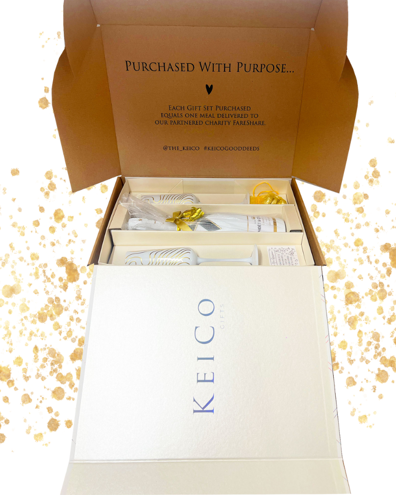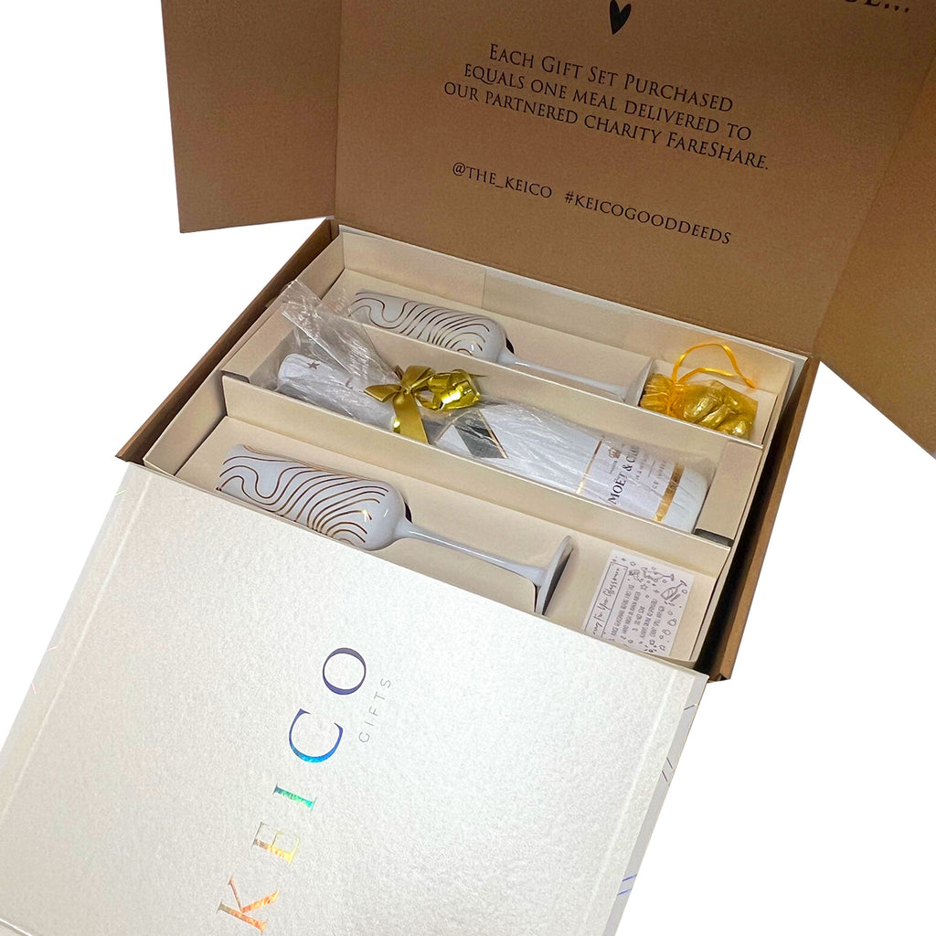 🥂Glassware: 2x Signature White & Gold Halo Champagne Flutes